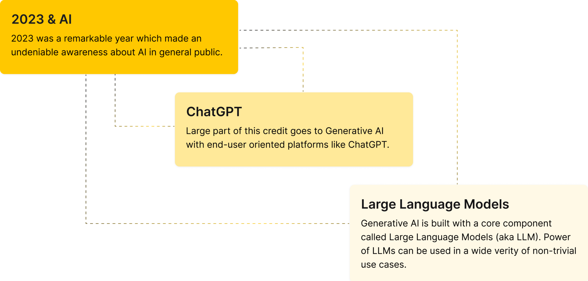 Generative AI is built with a core component called Large Language Models (aka LLM). Power of LLMs can be used in a wide variety of non-trivial use cases.